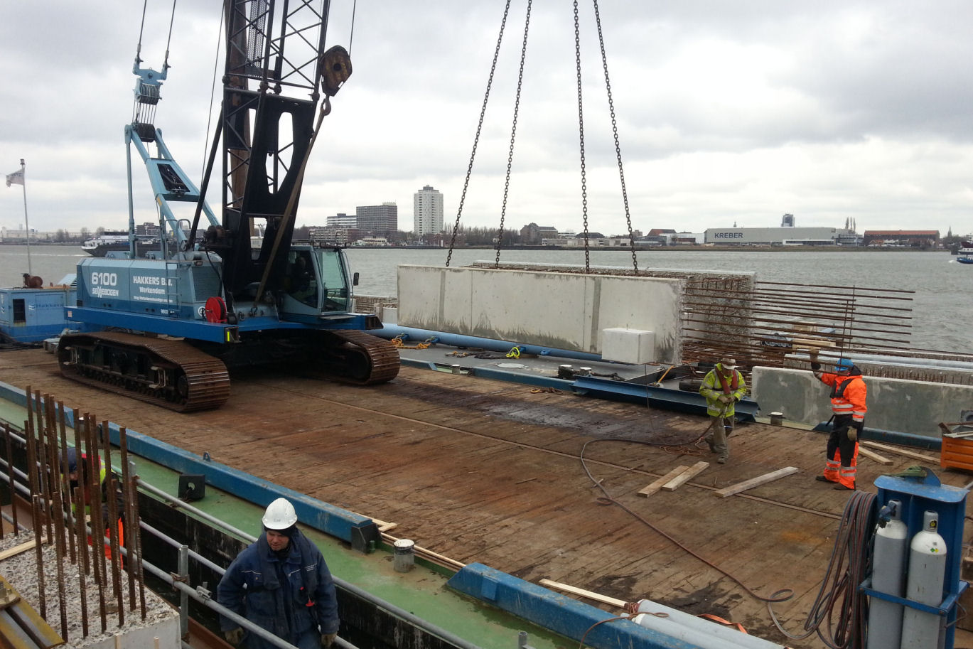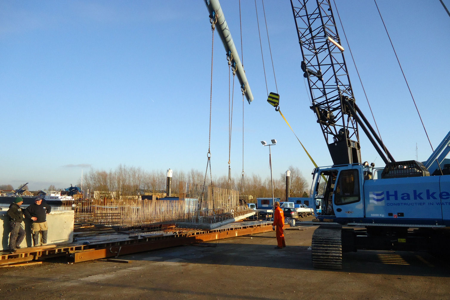 De prefab elementen werden op het terrein van Hakkers in Werkendam gemaakt, hierna werden de ligger, platen, consoles en kespen op kun uiteindelijk positie gehesen.
